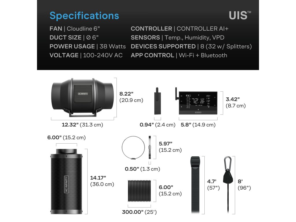 AC Infinity Air Filter Set AI+ PRO 150mm, Inline Duct Fan With AI+ Controller and Activated Charcoal Filter