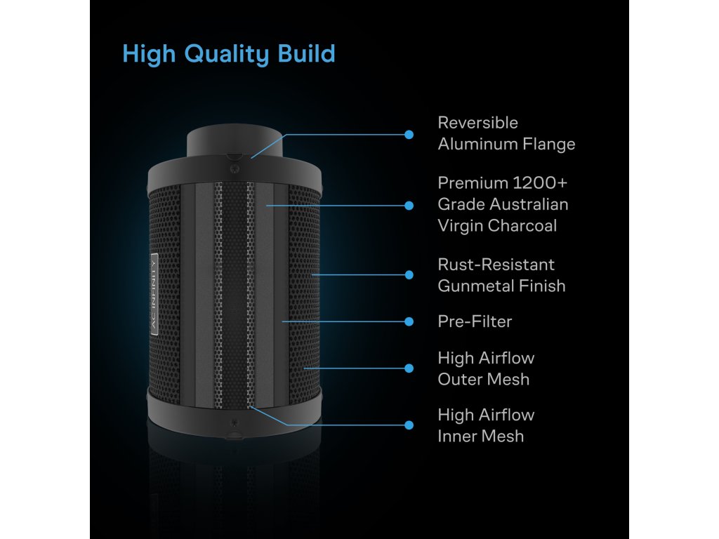 The carbon filter uses a 38 mm thick carbon bed made of high-quality Australian activated carbon (1200+ IAV, RC412 microporosity) and removes odors up to 33% longer than conventional filters. The heavy-duty construction with aluminium flanges, galvanized steel mesh and rust-resistant gunmetal finish offers maximum durability - even in high humidity.