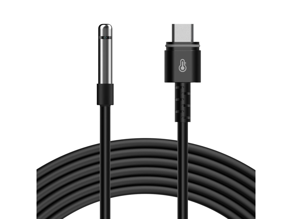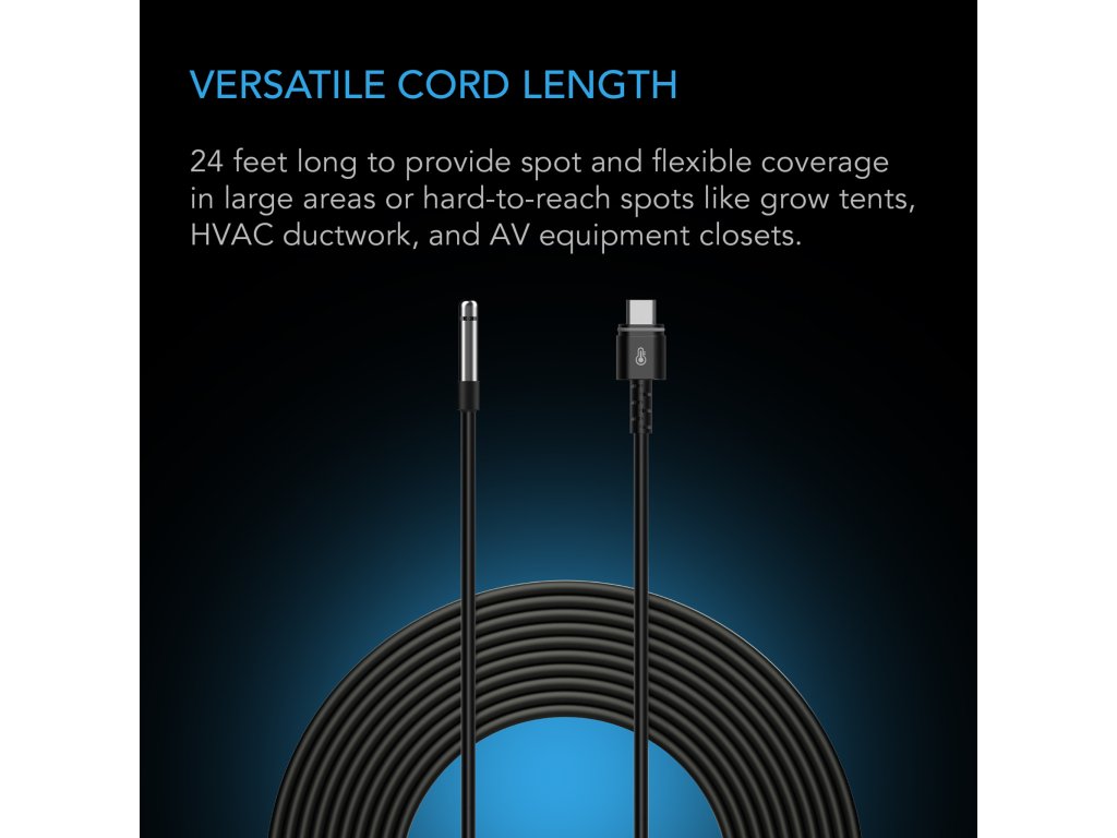 A smart sensor probe designed for Controller AI+ to detect temperature and humidity conditions, and calculate VPD measurements. Using a Swiss-made thermal alloy head, the climate sensor uses type 316 SAE steel that can adapt to rapidly changing climate conditions. This allows it to provide pinpoint accurate temperature and humidity readings and enables you to adjust your smart devices to your environmental needs quickly. The corded probe features a water-resistant gasket that blocks splashing water and dust so your controller can withstand humid conditions with IP-44 moisture resistance. It is 24 feet in length for spot detection coverage applications such as grow tents, HVAC ductwork, tool sheds, and AV component closets.