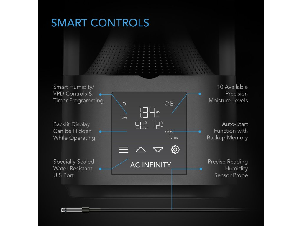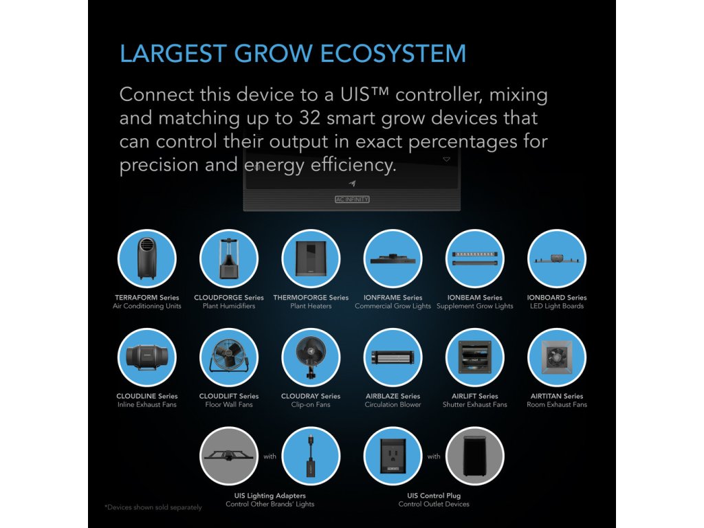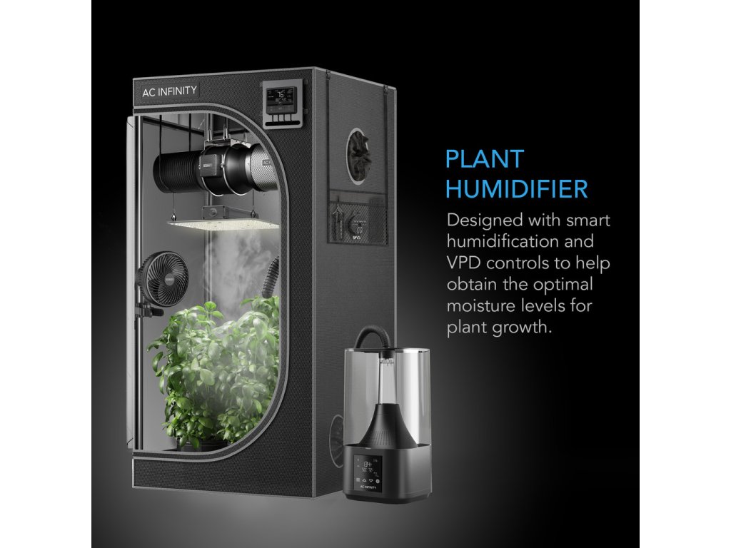 The humidifier is equipped with humidity triggers and VPD that intuitively generate humidity exactly when needed to achieve optimal conditions. Set up to 10 humidity levels, precisely tailored to plants in various growth stages. This smart humidifier can be integrated with other growing devices and UIS controllers to create a dynamic environment that can be controlled remotely via WiFi.