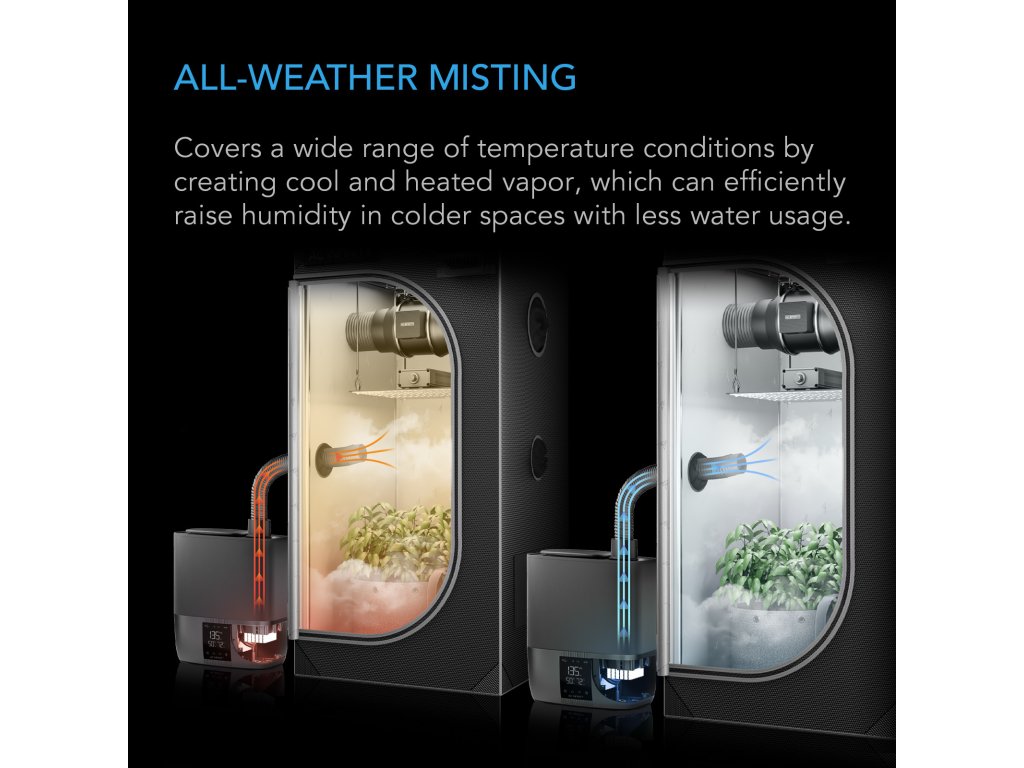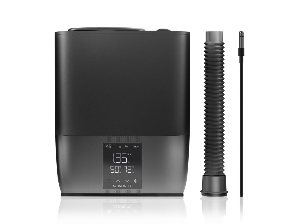 This intelligent humidifier is engineered for all-season performance, delivering precise vapor output to help maintain ideal humidity levels for year-round plant growth. Capable of warm mist output, it improves moisture distribution in cold environments where humidification is inefficient, reducing water usage while achieving optimal moisture levels. In addition, it utilizes an advanced UV-C sterilization system to purify the water supply before misting, promoting a cleaner and healthier grow environment. The misting is powered by a next-gen EC ultrasonic vaporizer with 10 levels of hot and cold mist for ultra-precise, customizable humidity control. Smart programming features VPD and humidity triggers, timers, auto-start with backup memory, and a backlit display that can be turned off to prevent night cycle disruption. This product is a part of the UIS™ platform of grow devices and smart controllers, designed to unite with the AC Infinity app over WiFi to achieve your ideal environment.
