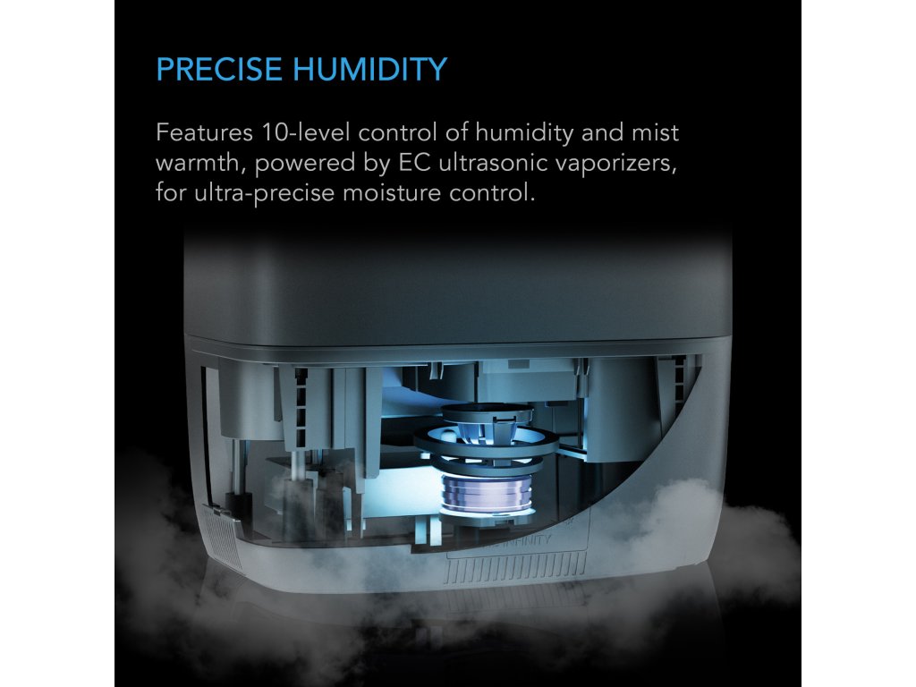 - Next-gen EC ultrasonic vaporizer delivers precise humidity output in a 10-level range of mist and heating for fine-tuned moisture control.