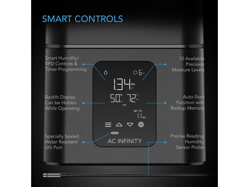 Features VPD and humidity triggers, timers, hidden backlit display, and automatic start with memory backup.