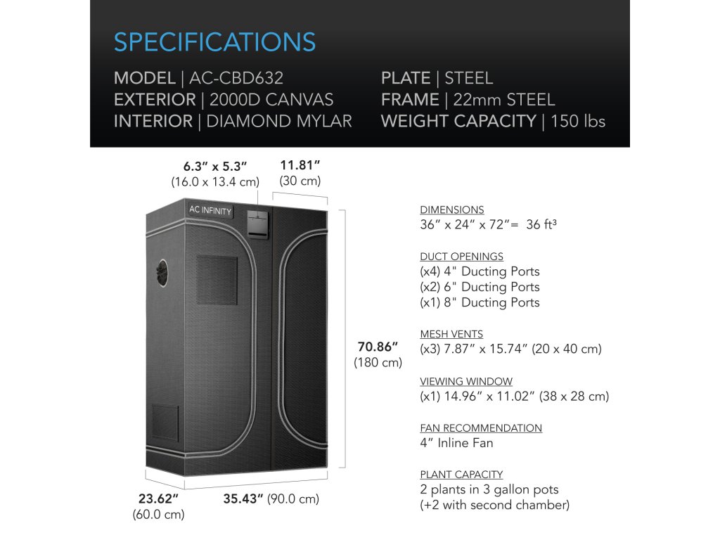 AC Infinity CLOUDLAB 632D, 2-in-1 Advance Grow Tent, 2000D Diamond Mylar Canvas - 90x60x180cm