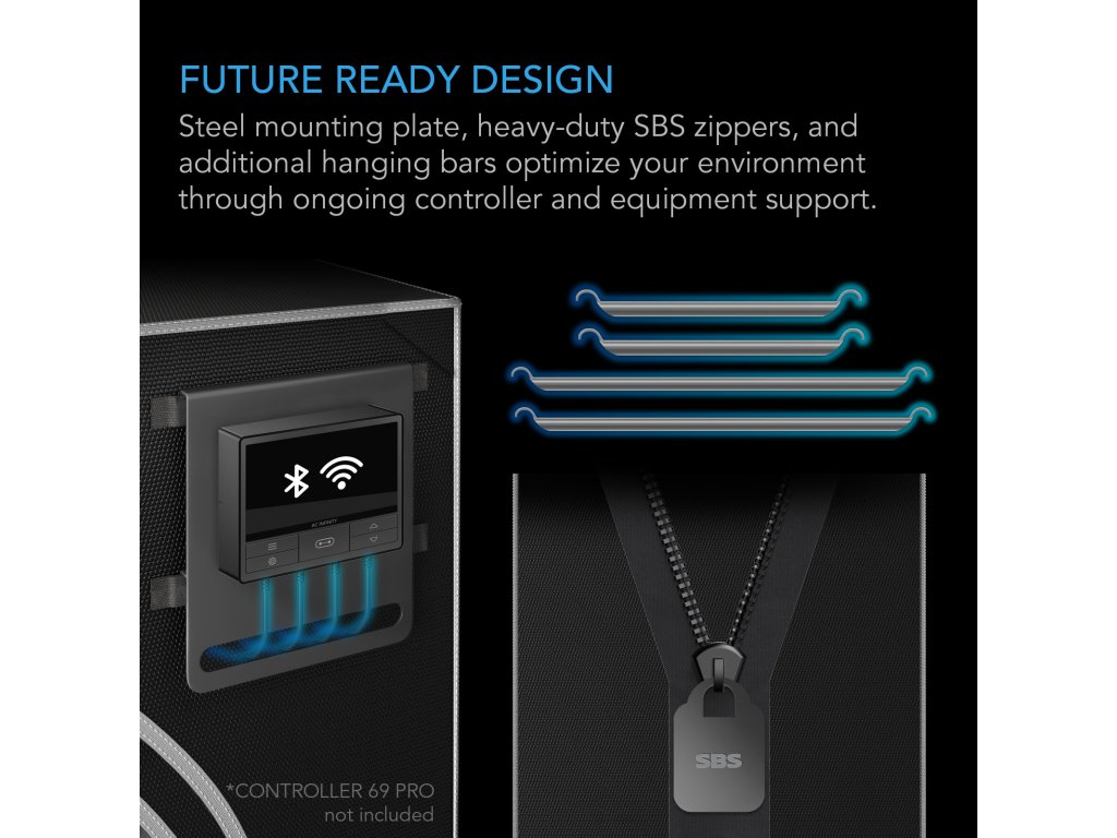A grow tent designed for indoor plant cultivation with complete control over the climate conditions. It has a second chamber where the top half is used for plants in the vegetative stage and the bottom half for plants in the seedling stage. This grow tent uses a waterproof Oxford fabric with 2000D thickness for increased durability and light proofing. Cross-patterned diamond mylar lines the inner walls and reflects the light from your grow lamp for maximum light output. Original SBS™ zippers ensure maximum comfort by sliding smoothly and securely along the track. An internal tape seam forms a seal along the SBS™ zipper inside the grow tent to ensure maximum reflection and prevent light leakage. This is complemented by a protective cover that runs the full length of the front zipper, providing additional protection from light intrusion. The ventilation openings can be closed on both sides to reinforce this light-tight seal. Accessories include a waterproof groundsheet, a detachable tool bag, additional roof hanging poles and a mounting plate for installing your controller to the grow tent.