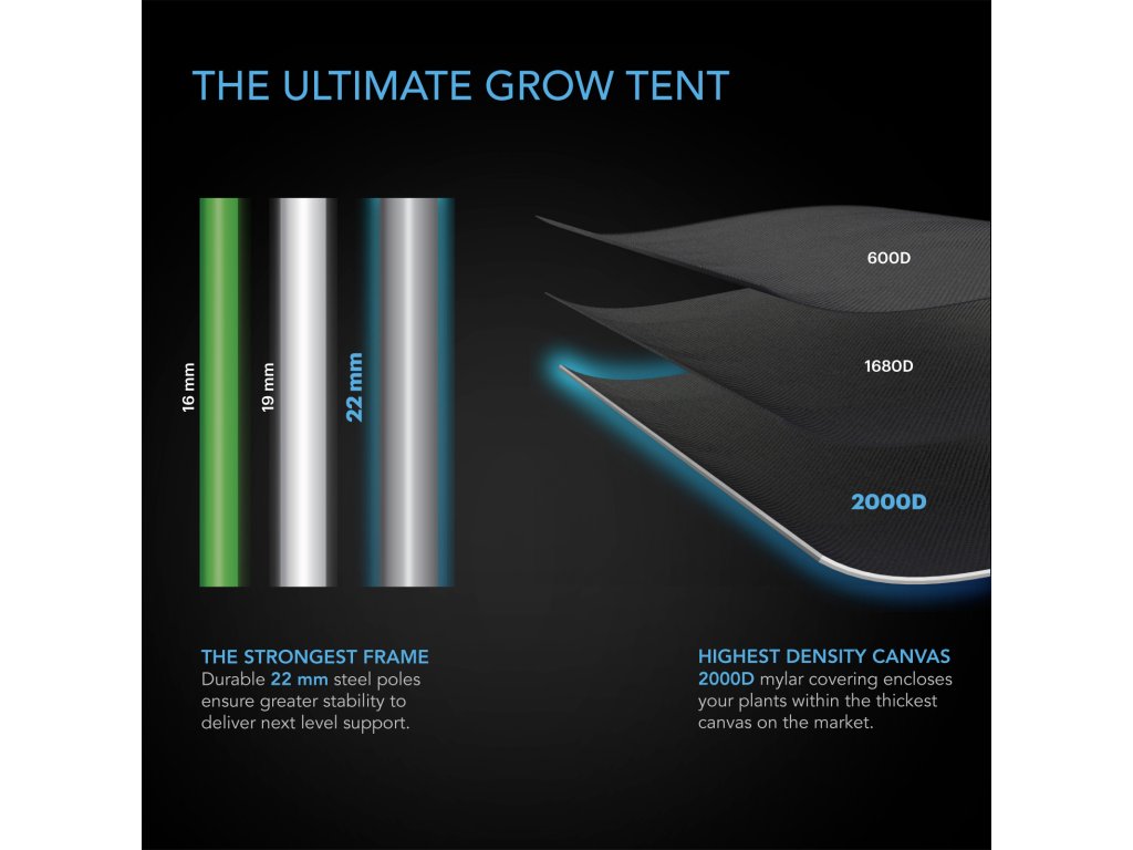 This grow tent is reinforced by the steel construction of its frame, which uses 22 mm diameter poles, compared to the 16 mm poles of standard grow tents. The corner pieces have the same stability and keep the tent upright and more stable than others. This, together with the roof supports, allows a load capacity of up to 68 kg of grow equipment when suspended from crossing points. A metal coating protects the steel poles from long-term wear and tear while providing a clean look.