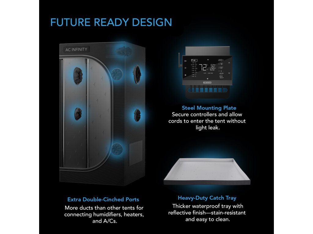 - Innovative controller mounting plate with lightproof cable passthrough and additional duct ports for humidifiers, heaters, and A/Cs.