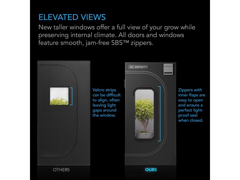 - Taller windows provide a full view of your grow while maintaining climate control, with SBS™ zippers that make it easy to open and close.