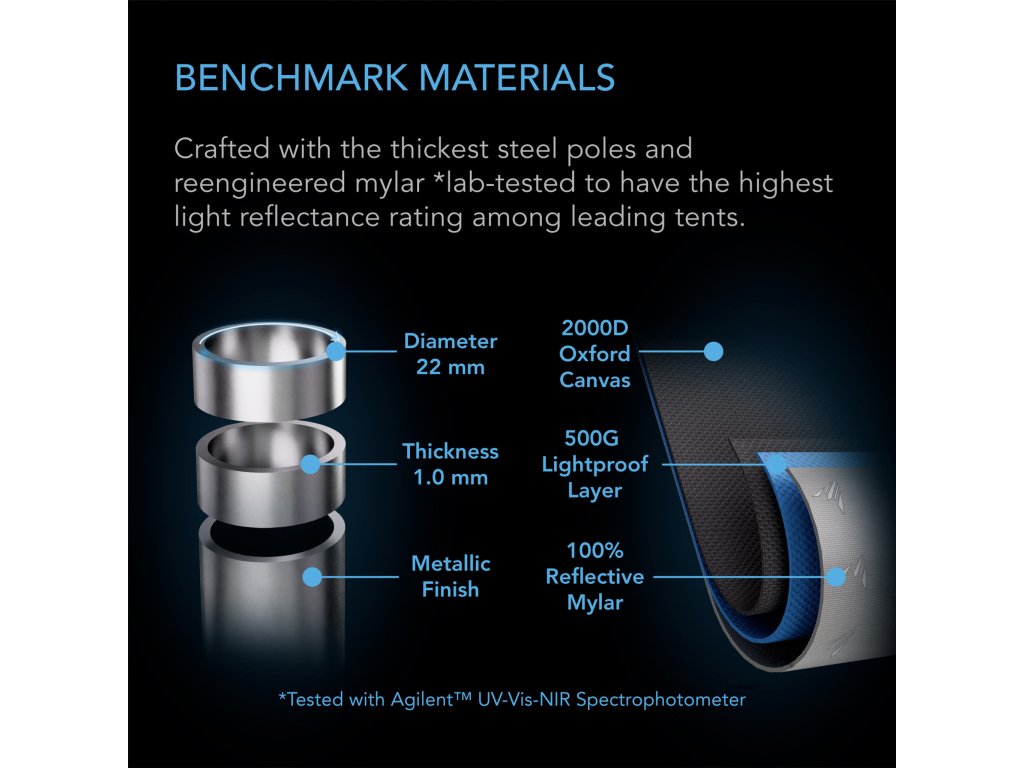 - Strongest 1 in. steel poles, thickest 2000D canvas, reengineered mylar lab-tested to have the highest light reflectivity among all grow tents.