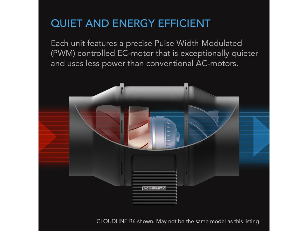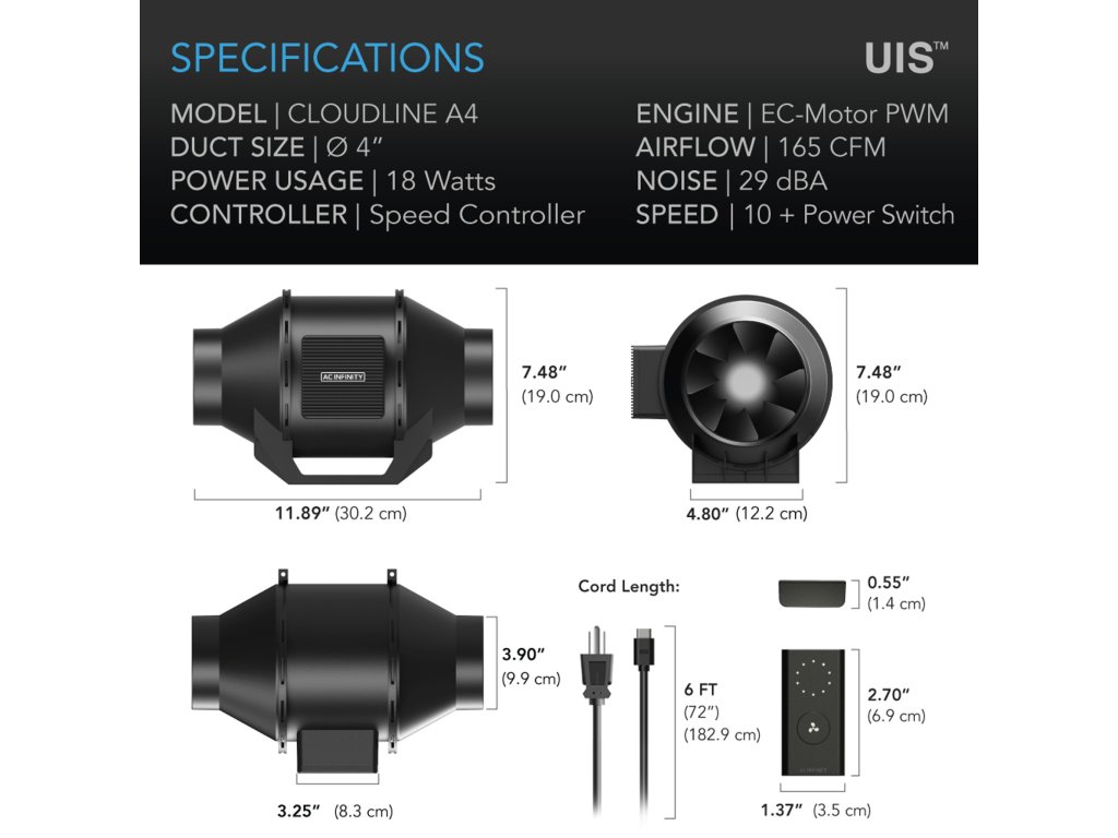 The speed controller enables you to set the duct fan’s speed to optimal noise and airflow levels for various environments. This inline fan is equipped with the CLOUDLINE Series’ same EC-motor that is precisely controlled using PWM (Pulse Width Modulation), which enables it to run smoothly at extremely low RPM speeds without generating motor noise. Ten speed options are available with power switch and backup memory. This model can be connected to the following smart controllers to share the same programming and power source as other EC-motor CLOUDLINE fans:
