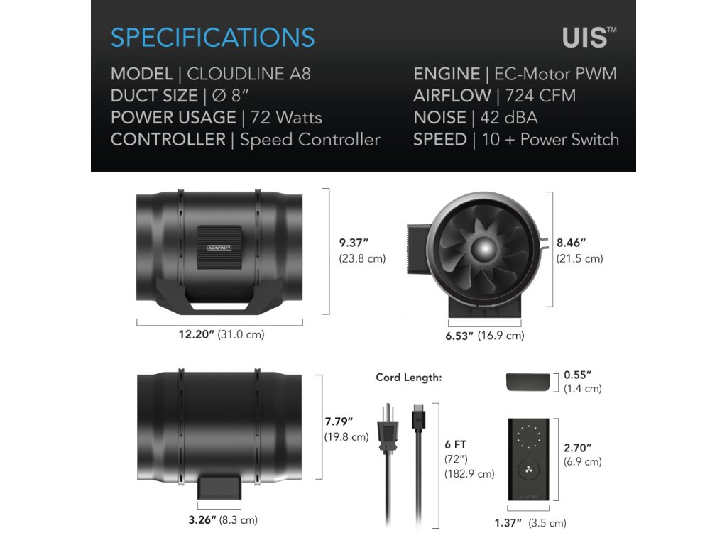 AC Infinity CLOUDLINE A8, Quiet Inline Duct Fan with Speed Controller - 200mm
