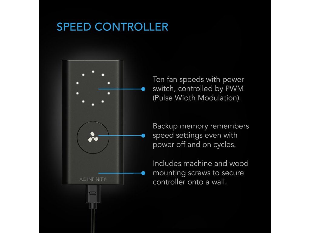 Precise Speed Controller: The controller allows you to adjust the fan between ten speed levels to achieve optimal airflow and minimal noise. It also features backup memory to retain the last setting in case of a power outage.