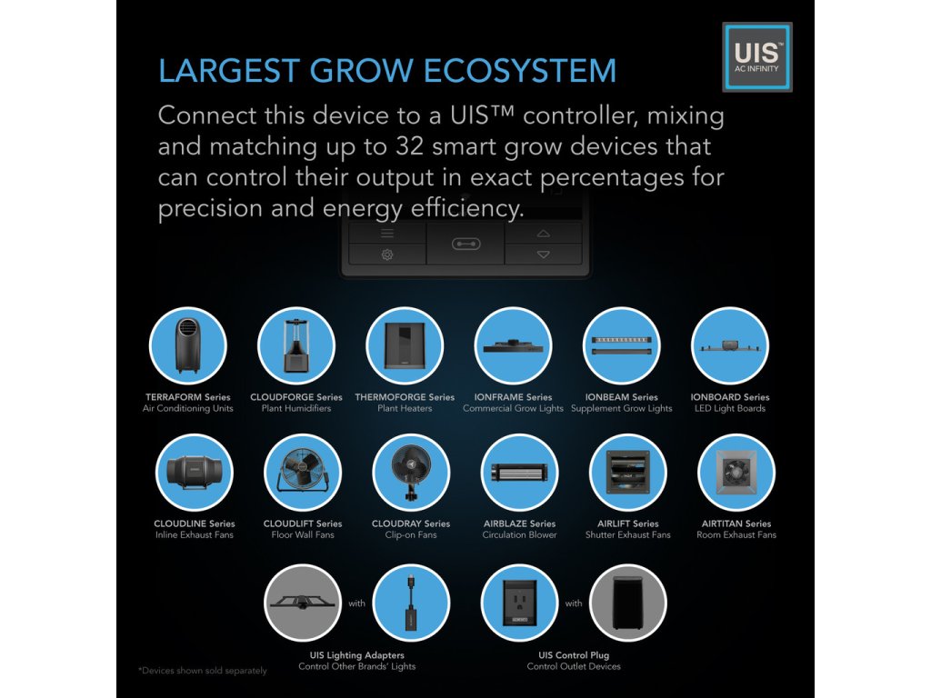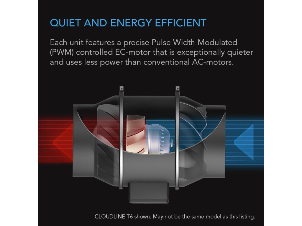 Designed for quiet ventilation of grow tents, heat transfer, and cooling of rooms, fresh air circulation, and cooling of AV cabinets. Equipped with a wired controller with 10 speed settings; compatible with all UIS controllers featuring smart programming. The PWM-controlled EC motor ensures silent and energy-efficient operation with minimal heat and noise. The mixed airflow design with a stator blade and hydrodynamic wind rings enables air delivery even in areas with high resistance.