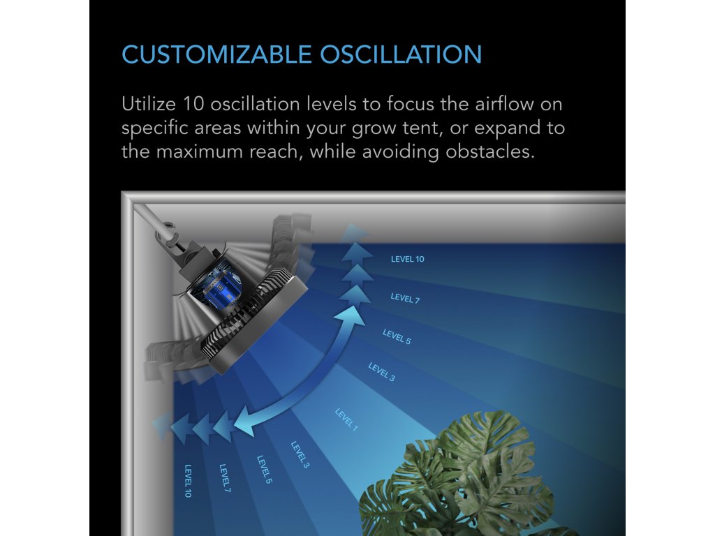 Gain unprecedented customization options for complete control over airflow with 10 speed levels, 10 dynamic wind modes, and 10 oscillation settings. Unique settings for each growth cycle ensure maximum airflow strength, promoting healthier growth and reducing plant stress. The oscillation range offers complete coverage of the tent space while avoiding obstacles. With this fan, you can set precise circulation for any plant growth phase—from a gentle breeze for germination and seedlings to a strong airflow for vegetative and flowering stages.