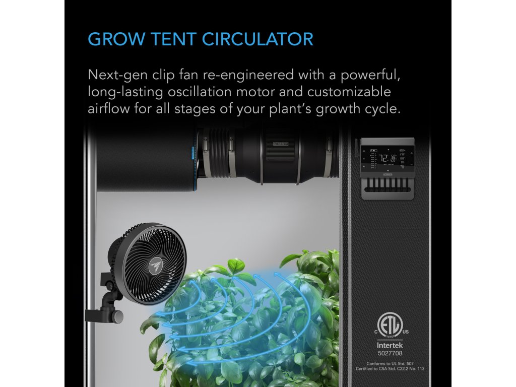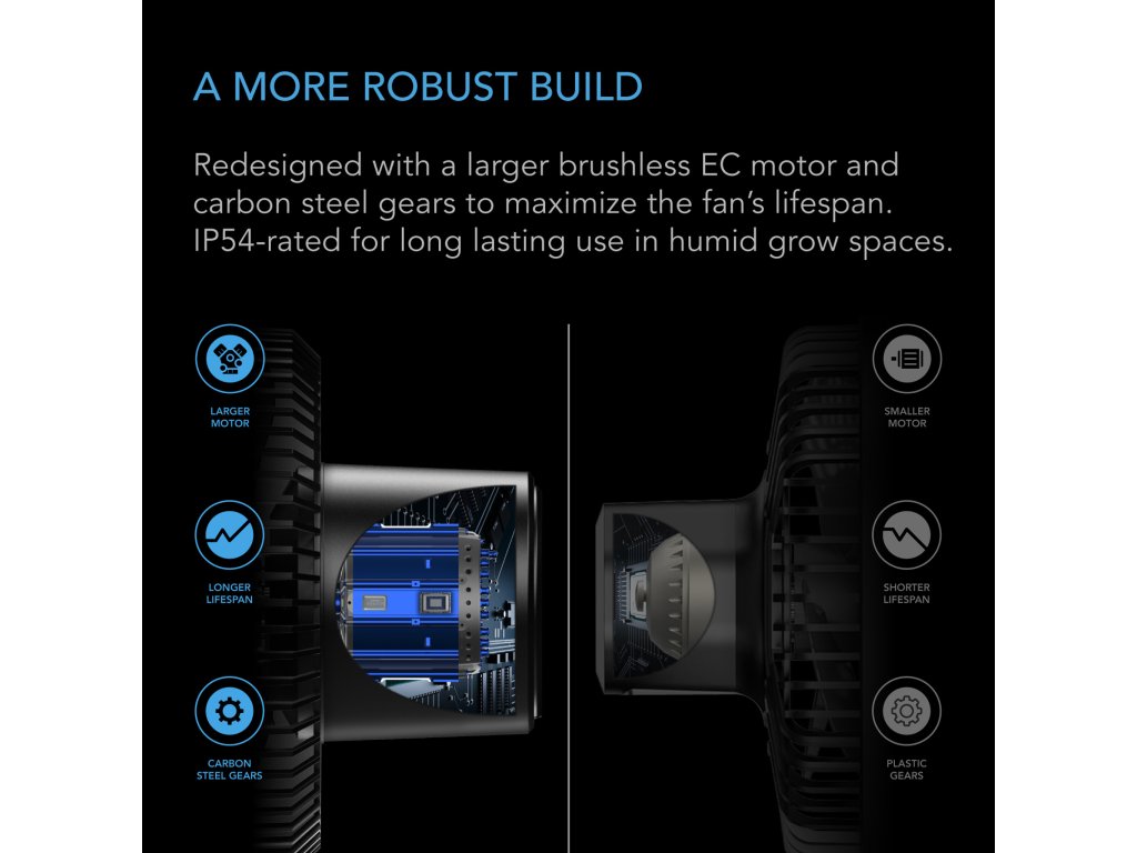 This clip fan is equipped with a robust EC motor designed specifically in size and construction to extend the lifespan of oscillation. Its clip is reworked with a compact metal frame that saves space in your grow tent, featuring a clamp-like design for greater safety on tent poles. Additional reinforced elements include a brushless motor, durable carbon steel gears, and double ball bearings for omnidirectional mounting. These components make it the most durable clip fan, long-lasting, energy-efficient, and generating strong air circulation.