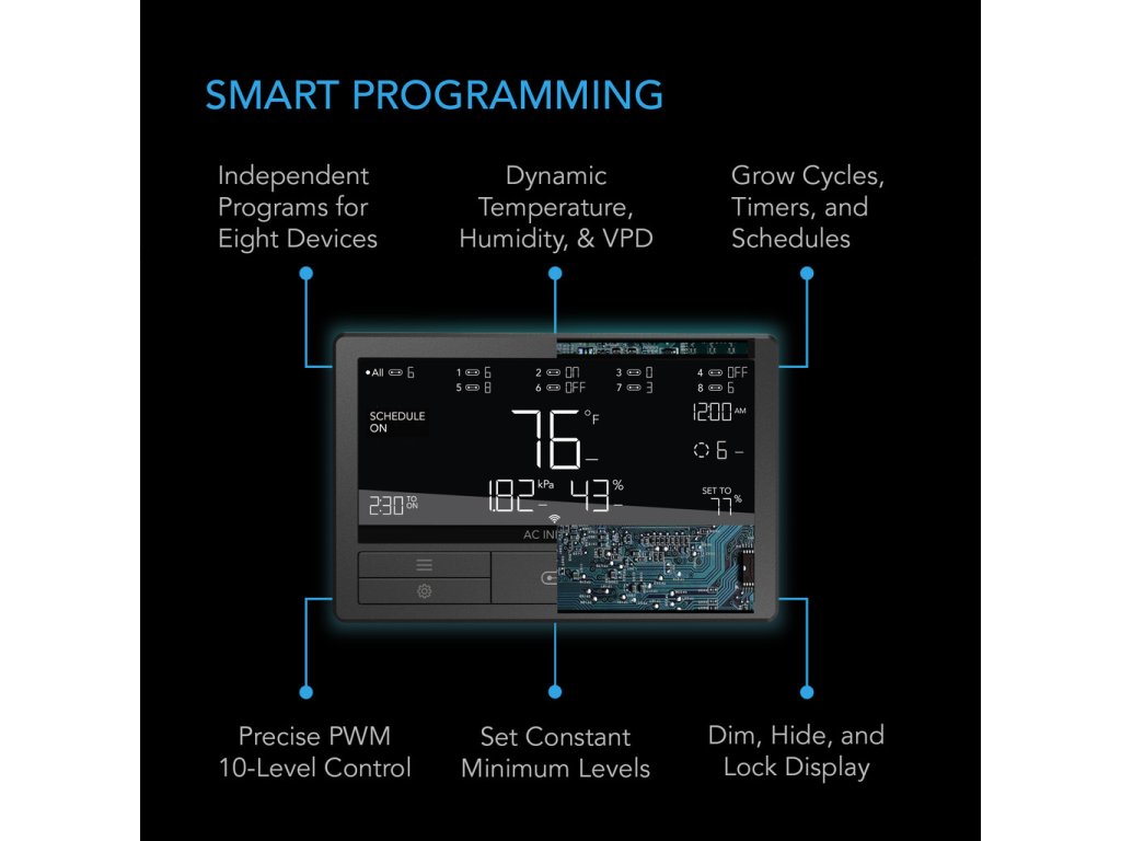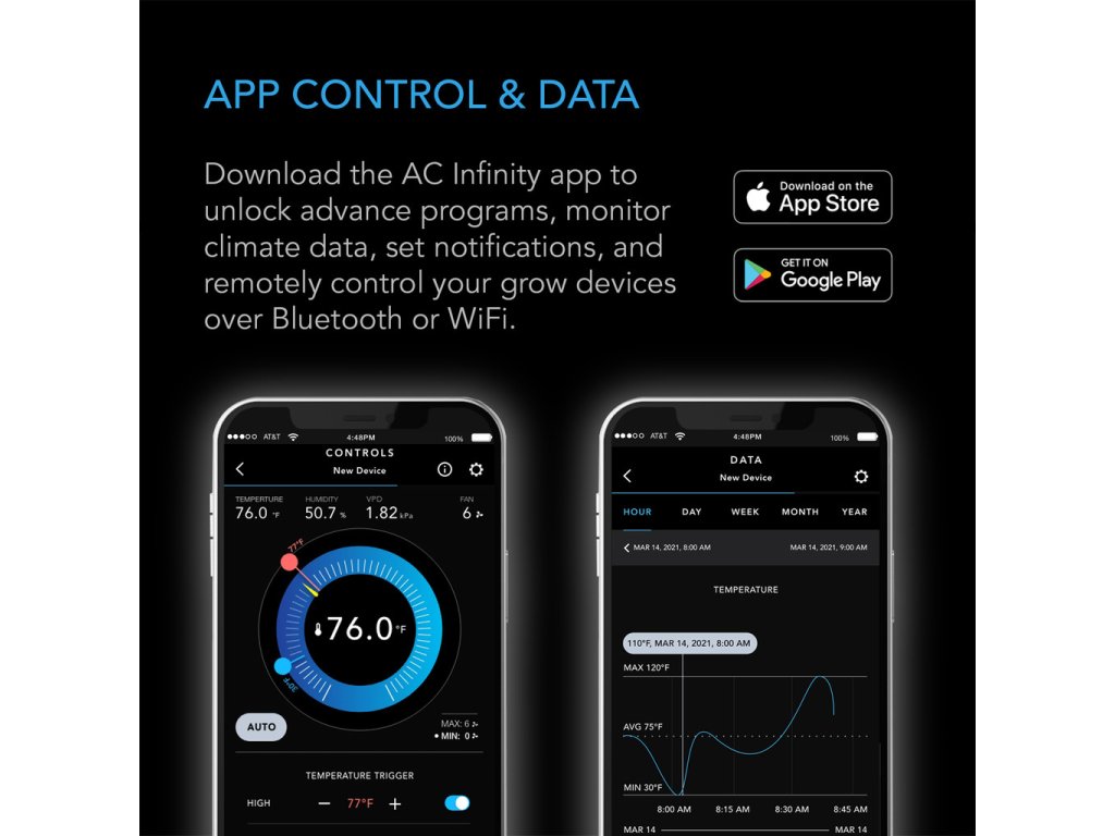 The CONTROLLER 69™ PRO+ allows you to connect up to 8 devices with independent programming options. Set dynamic programs for fans and lights that automatically adjust based on temperature, humidity, and VPD. You can also set minimum levels to keep devices running, increasing only when trigger points are activated. Timer programs, cycles, and schedules allow you to tailor device activation to your growth needs. For maximum convenience, all devices can be controlled through the AC Infinity app, which connects via Bluetooth or WiFi, providing remote access, alarms, notifications, and climate data analysis.
