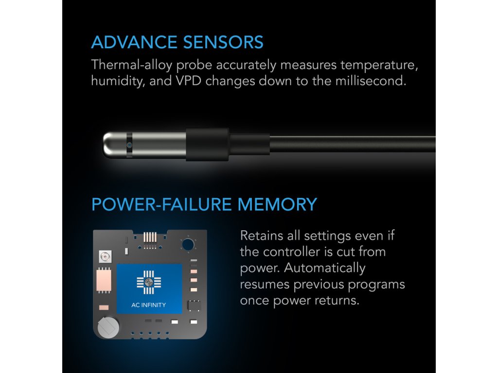 CONTROLLER 69™ PRO+ is an innovative digital thermostat that provides a smart and automated way to manage all AC Infinity devices. This controller is compatible with up to eight devices, allowing you to set independent climate and time programs for each connected product. With a backlit display showing temperature in Fahrenheit or Celsius, you can measure temperature, humidity, and VPD for more precise control of growth conditions. The thermally alloyed sensor measures current temperature and humidity with accuracy, ensuring optimal conditions for your plants. This controller also supports VPD detection, allowing you to control not just temperature and humidity, but also the temperature of the plant leaves to maintain ideal growth conditions.