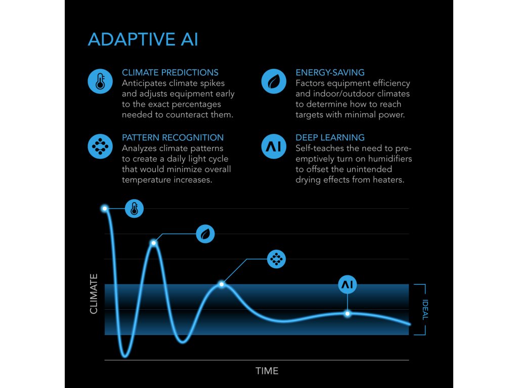 - The AI analyzes climate patterns and anticipates peaks to program devices to dynamically deliver the exact amount of power needed to maintain an optimal environment.