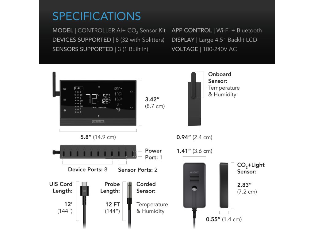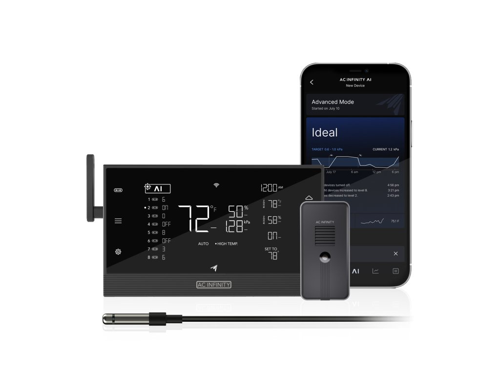 The CONTROLLER AI+ is the first to utilize artificial intelligence for universal device control and complete monitoring of your grow. This kit includes our innovative CO2 sensor with adaptive self-learning system that automates the critical task of monitoring and maintaining optimal CO2 levels to ensure healthy and vigorous plant growth. Using AI-based insights, this self-automating controller provides unprecedented accuracy and stability while avoiding extreme environmental fluctuations. Connect up to 32 UIS™ devices (when using distribution hubs) such as fans, plant lights, humidifiers and heaters to optimize temperature, humidity and VPD levels in your grow room. It also features smart outdoor monitoring that tracks the climate inside and outside your tent for even better control. As a reliable ecosystem, this smart platform can maintain programming even if the Wi-Fi connection is lost, keeping your grow safe and optimized. This product is part of the UIS™ platform of attachments and smart controllers, designed to connect with the AC Infinity app via Wi-Fi to create your ideal environment.
