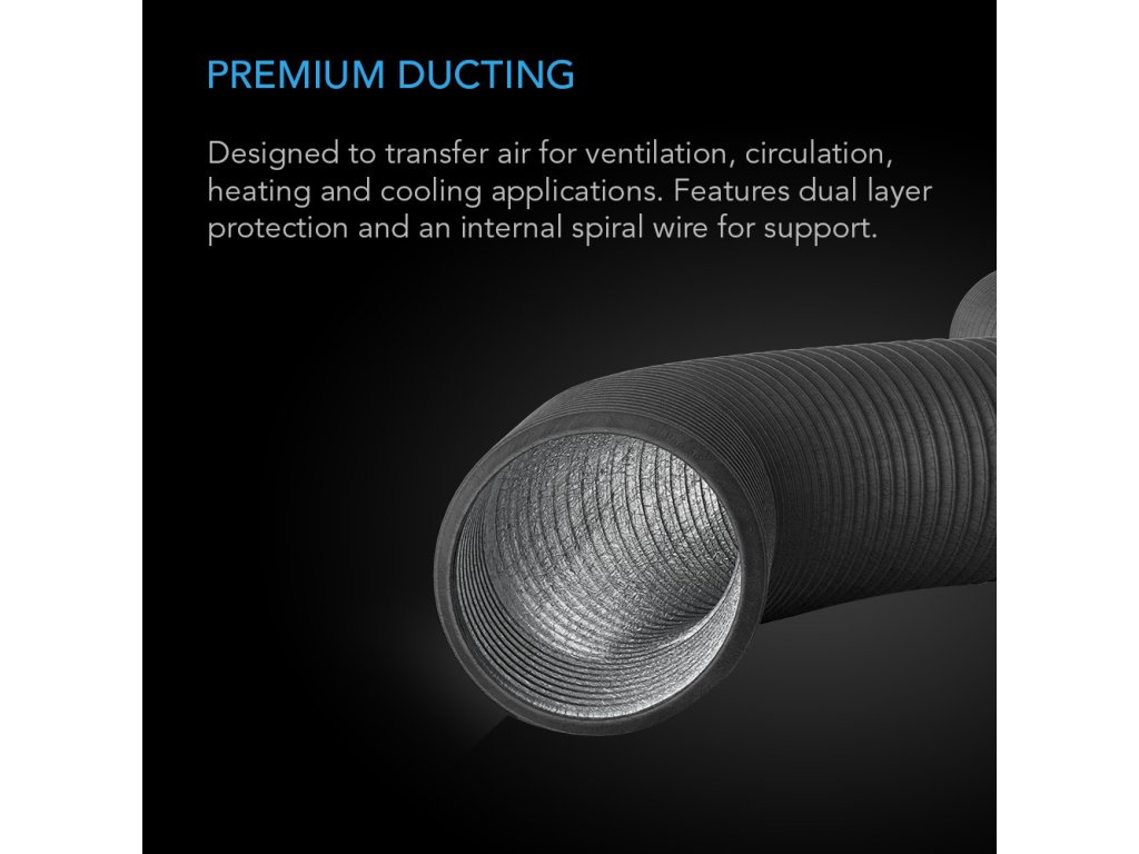 This ducting is designed for various ventilation, circulation, and heating/cooling transfer applications. It features four-layer protection, making it more durable and resistant to leaks than single-layer designs. The internal layer is made of heavy-duty dual aluminum foil that is fire/flame resistant. Its outer layer utilizes dual PVC thermoplastic that protects the aluminum from cuts and tears while stopping leakage. Each duct tube is held together by an internal steel-wire spiral that is flexible and easy to install in hard to reach places. The ducting can be shortened by cutting the tube to fit various applications. Includes two stainless steel duct clamps.