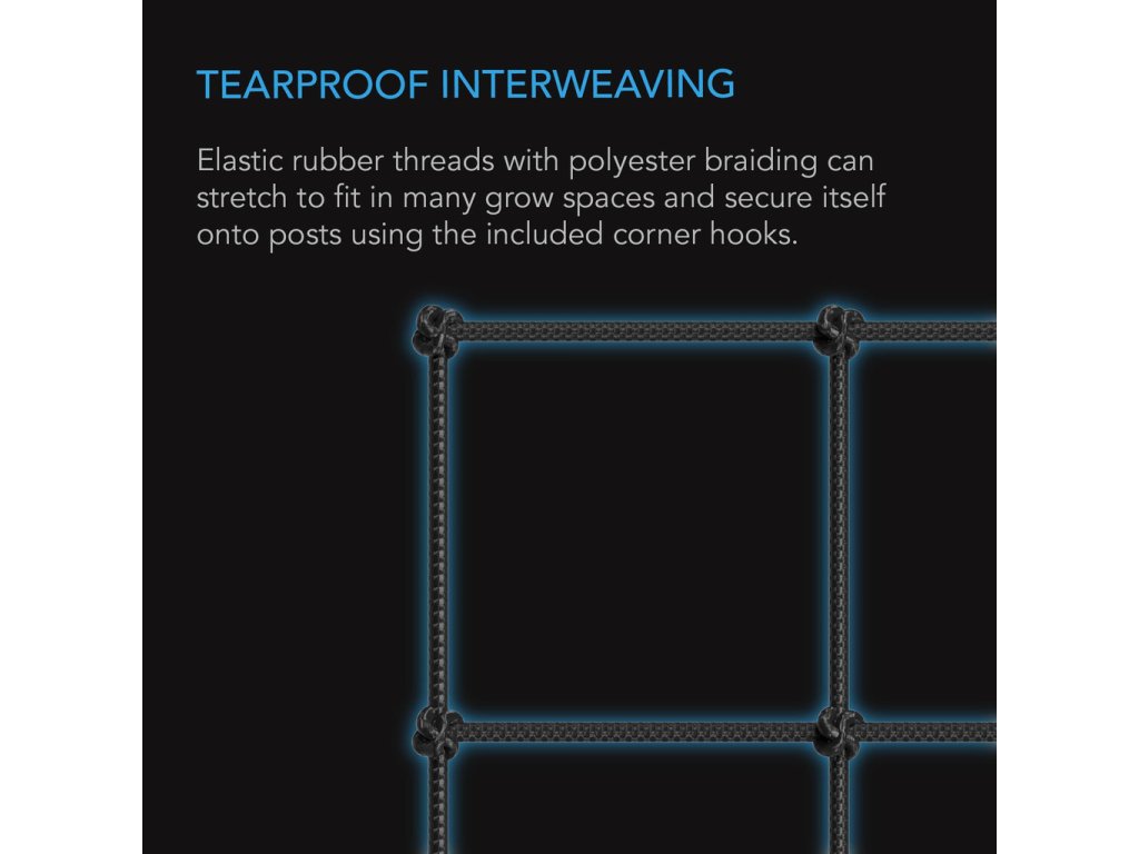 This net is ideal for providing support to plants in your grow tent. The elastic rubber cords, coated with high-quality polyester, can withstand high tension and are perfect for plants that require sturdy support. The cell system does not damage stems and provides space for trimming and harvesting. This net is suitable for flowers, vegetables, tomatoes, eggplants, and other climbing plants.