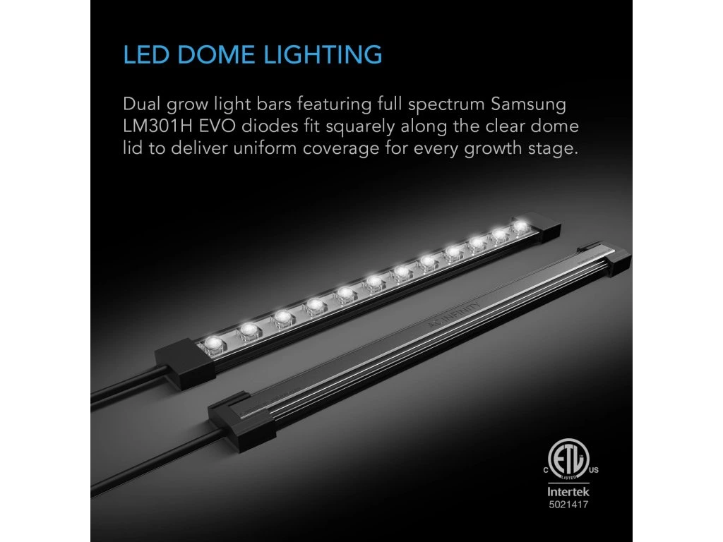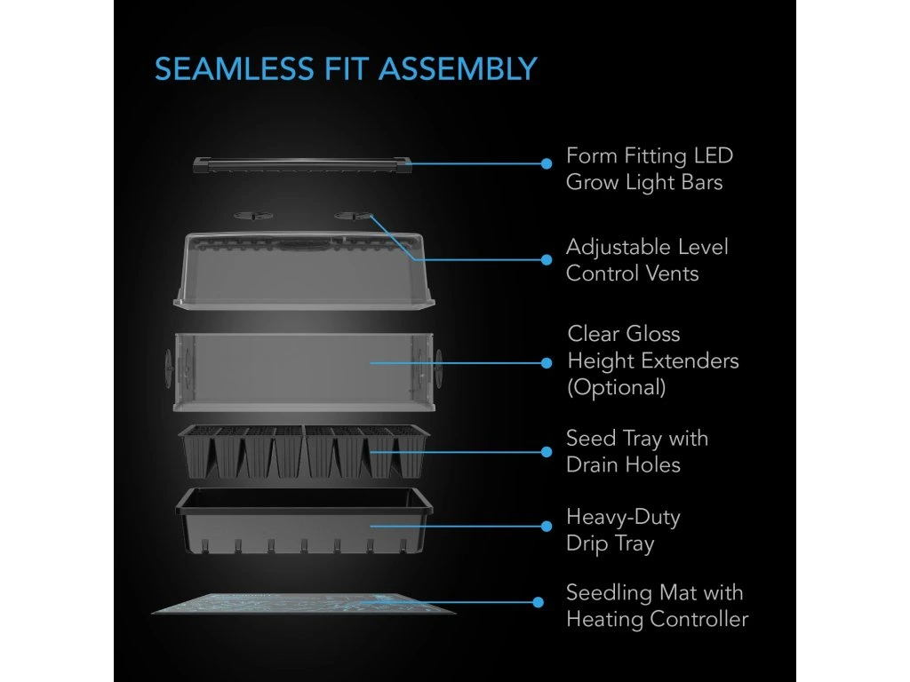 With two full spectrum LED light bars that provide plenty of light to strengthen the stems of your seedlings and ensure their long-term health. Each LED grow light bar is equipped with genuine Samsung LM301H EVO diodes, the latest technology for garden lighting, providing intense brightness with higher efficiency. This performance is better than the leading Samsung LM301H and LM301B LEDs as well as the Bridgelux 3030 and other previous generation LEDs. EVO diodes improve plant growth by providing better light quality and higher light output per diode, with a higher blue component and higher efficiency compared to non-EVO diodes. The cover is specifically tailored to these LED light bars and provides a platform that eliminates the need to purchase and install external lighting. Featuring a timer controller with four dimming levels and timer settings that repeat daily to further maximize seedling growth.