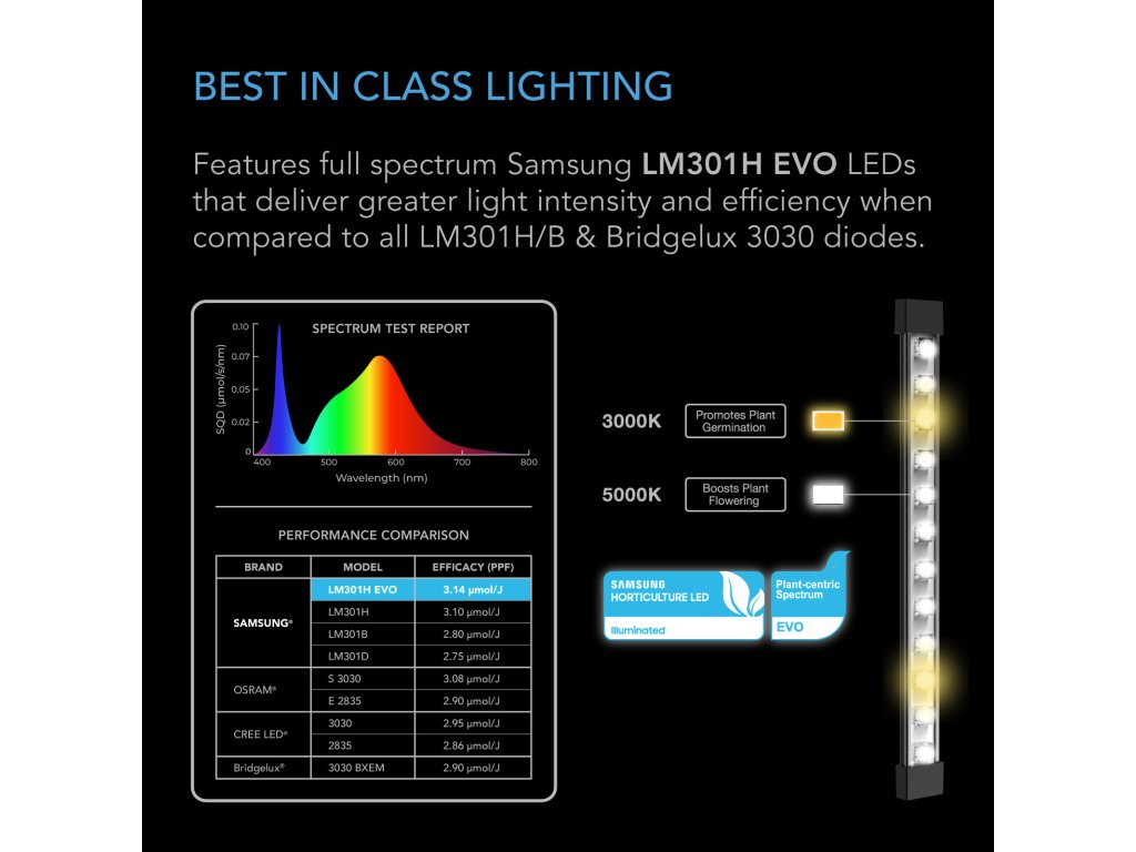 - Equipped with Samsung LM301H EVO LEDs, each with an efficiency of 3.14 µmol/J - for maximum luminous efficacy and energy efficiency