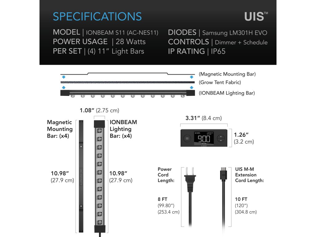 The IONBEAM S11 LED strips were developed to be used as intermediate, supplementary or primary lighting in indoor grow rooms. Optimally positioned, they improve light distribution and promote the growth and yield of your plants. Each strip consists of a robust unibody housing with IP65 protection against dust and splash water - ideal for humid environments. The solid aluminum body also serves as a heat sink, which extends the service life of the high-performance LEDs. The light spectrum is based on the latest Samsung LM301H EVO diodes, which are more powerful and efficient than LM301H, LM301B or Bridgelux 3030 LEDs - with an increased blue component and higher photon output per diode. The set contains four LED strips, four additional rods for magnetic attachment and screws for permanent mounting - also suitable for small grow setups as the main light. Also compatible with germination boxes and humidity domes. This product is part of the UIS™ platform for grow devices and smart controllers. The platform connects to the AC Infinity app via Wi-Fi so you can easily and precisely control your environment.