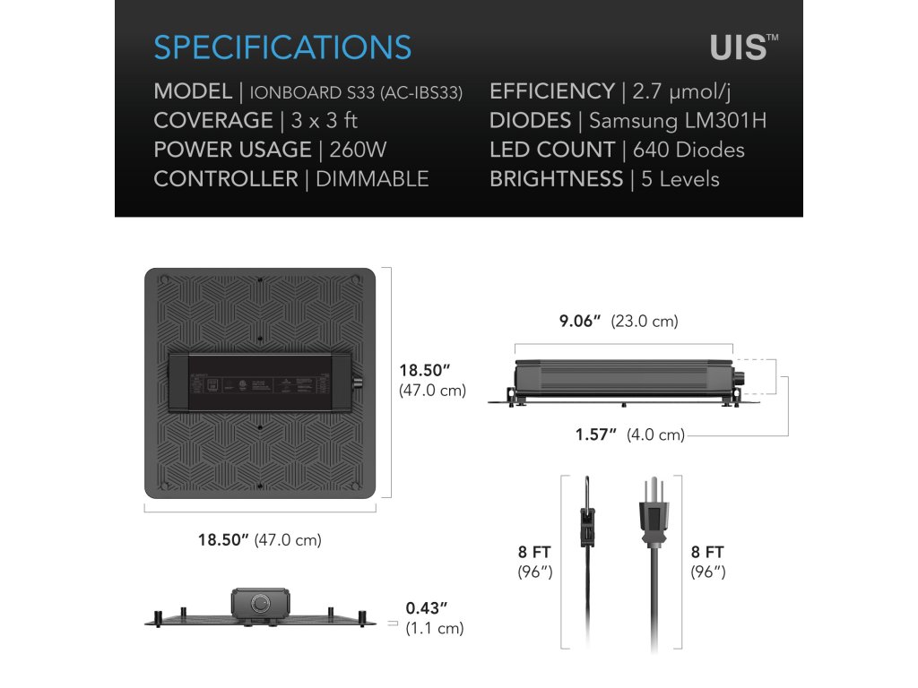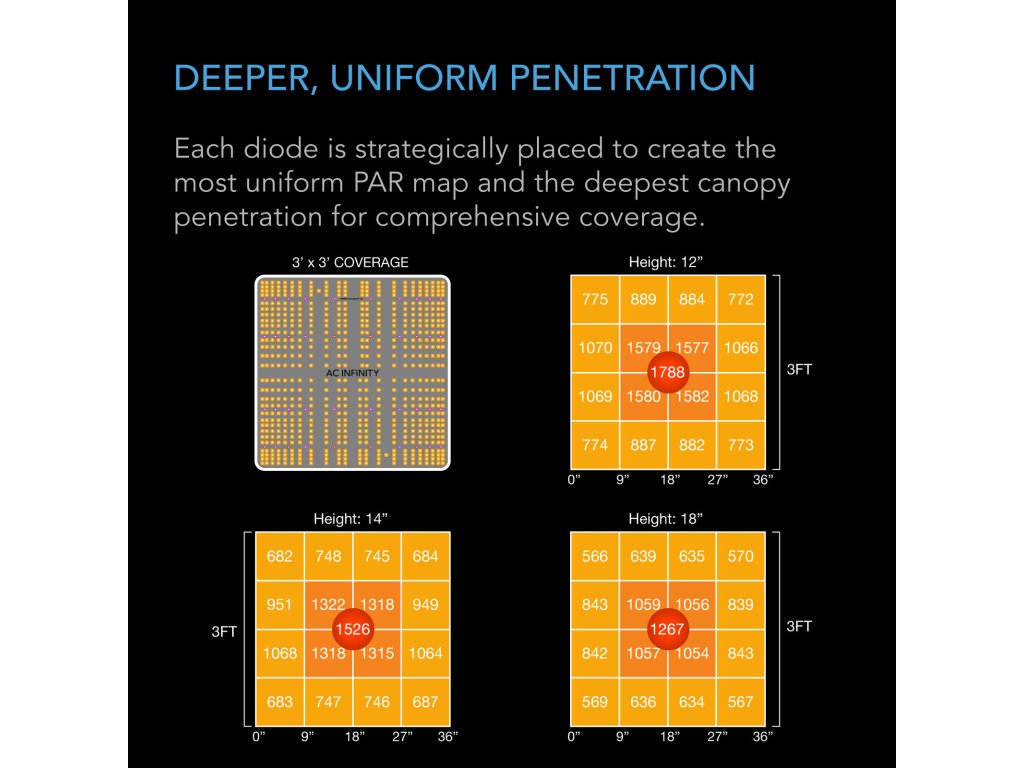- Algorithmically placed diodes for uniform PAR coverage and maximum light output right up to the tips of the blades.