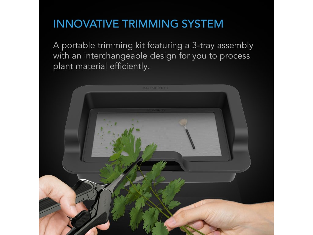 This trimming tray includes sorting and sifting screens that are easy to swap to handle all your plant processing needs. In addition to these and the two collection bins, the full kit also features pruning shears and a soft-bristled brush so you can quickly start harvesting and collecting. The additional unused tray can be used as a convenient storage space for your collected trimmings.