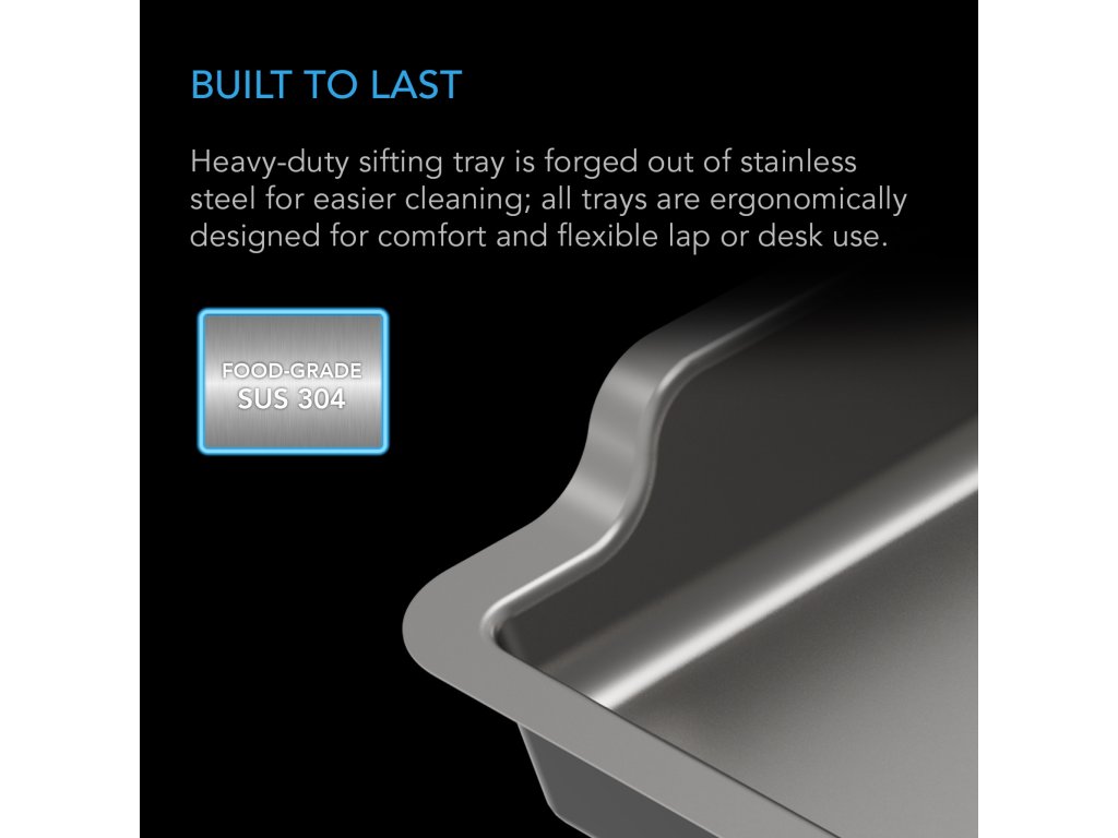 A premium plant trimming system designed to help you process finely harvested herbs, buds, flowers, and more. Its interchangeable design features a 150-micron sifter screen and ABS 757 sorting screen that can be quickly swapped, giving you the flexibility to process smaller or larger plant trimmings. The sifting tray is constructed from food-grade stainless steel, supporting easy cleanup after each session to prevent unwanted residue build-up. This optimized surface also allows you to fully collect pollen and other fine plant material without it getting stuck. The sorting and sifting trays let you trim plants on your lap or your desk, while the top layer trim tray’s walls are elevated to keep your trimmings safely contained. The trim tray is also ergonomically shaped to maximize comfort while you are working.