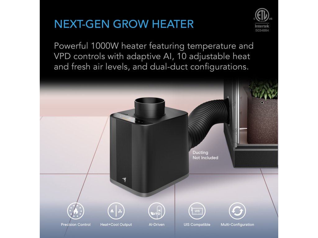 Experience precision-engineered climate management with this powerful 1000W AI-driven heater. Designed to optimize growth through every stage, it automatically adjusts temperature, airflow, and VPD to maintain your target environment. Individual PTC plates with PWM control deliver 10 true heat levels or fresh air intake for balanced conditions, while dual duct ports support both open- and closed-loop setups for versatile integration. This product is ETL-certified with safety features including tip-over alarms, flame-retardant materials, and overheat protection with auto-restart it delivers performance you can trust. Designed exclusively for indoor use. Operate only in controlled environments with humidity between 30%–65% RH, including incoming airflow. Do not use outdoors or in high-humidity areas. Do not use with humidifiers in closed-loop setups. Mist may enter intake ducting and damage the heater. Plug heaters only into a grounded wall outlet with surge protection. Never use extension cords or power strips, as this may cause overheating or melting. Do not share the outlet with other devices.