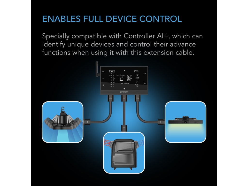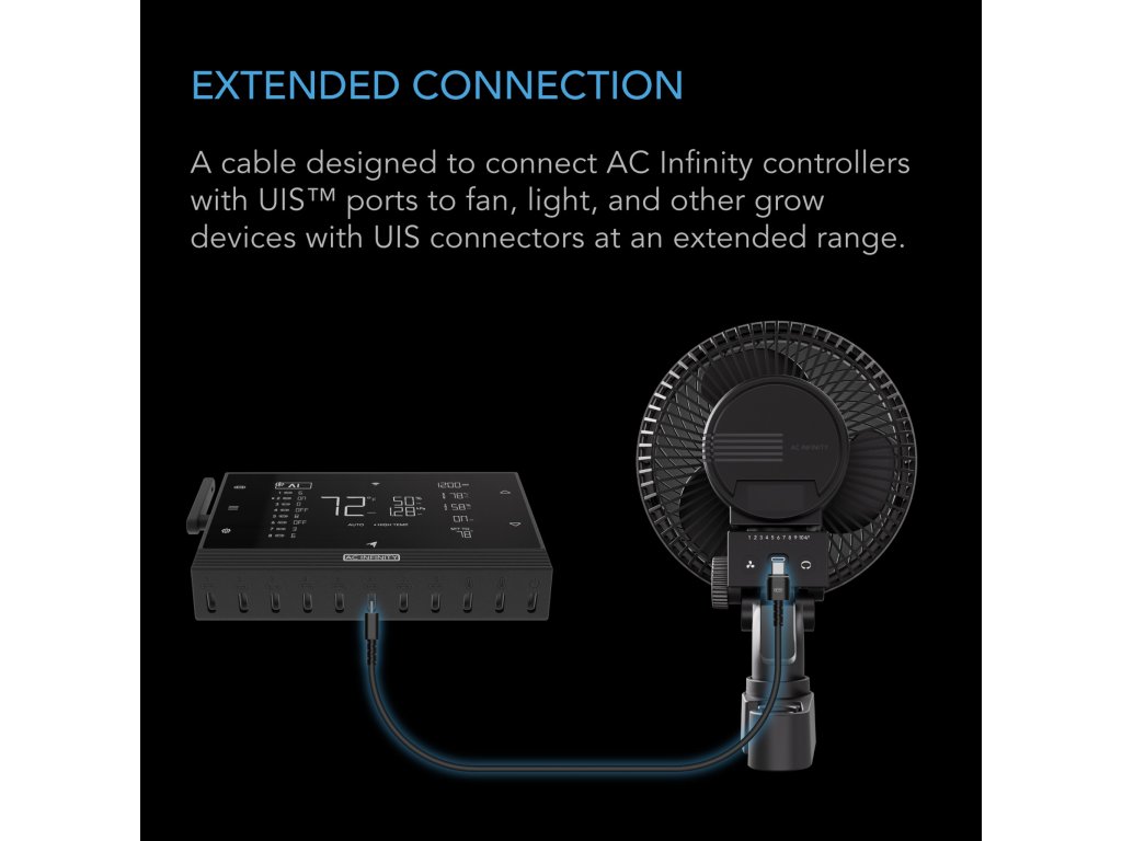 An extension cable designed to connect AC Infinity controllers to smart devices such as fans, grow lights, humidifiers and heaters for use in grow applications. This maximizes the utility of your smart controller by extending its range to compatible devices while enabling smart programming such as climate triggers, timers and scheduling. Its compact design is engineered for UIS connectors and ports to ensure a solid, secure connection. Fully compatible with Controller AI+, it enables control of device-specific functions such as clip fan oscillation and supports unique device identification.