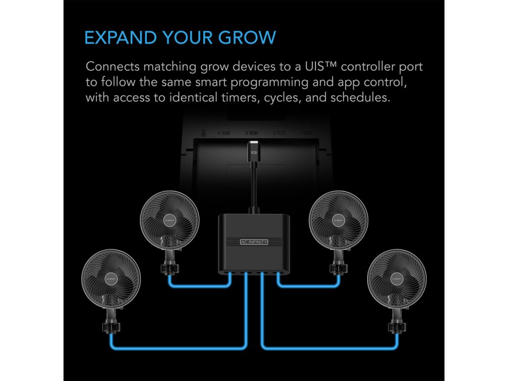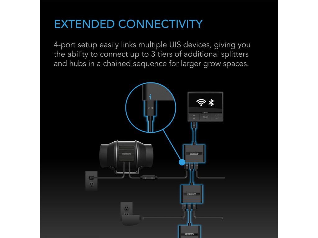 The Splitter Hub is the perfect solution for expanding your growing system. Connect up to four identical growing devices to a single UIS controller port, and everything will operate under the same programming. Each device connects to the UIS controller and is controlled based on the shared program. The hub is robust and highly durable, designed to ensure a strong and stable connection to UIS ports and connectors. It supports connecting up to three levels of devices using additional splitters and hubs. Compatible with various AC Infinity controllers, it is an ideal solution for efficient growing environment management.