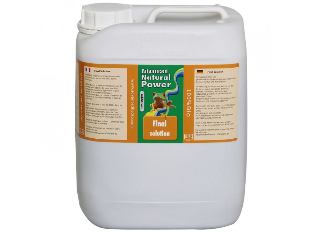During the last 2 weeks before harvest it is advisable to water the plants without added fertilizers in order to obtain as pure of a final product as possible. “Final Solution” helps to decompose and remove the last residue of fertilizers in the growing media also, works as a prevention of mold. “Final Solution” can be used with any kind of growing media as the only agent to be mixed in the water.