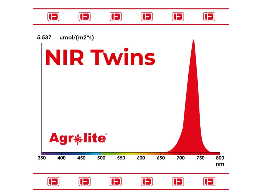 The NIR Twins supplemental bars are specifically designed to complement Agrolite's QB fixtures. They deliver controlled infrared radiation (730 nm) that stimulates key physiological processes in plants, such as cell elongation, Emerson effect activation, and flowering cycle synchronization. They enhance photomorphogenic responses and optimize the structural development of the crop.