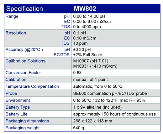The MW802, with a conductivity range that goes up to 6.00 mS/cm and the TDS up to 4000 ppm is ideal for testing in crop production.