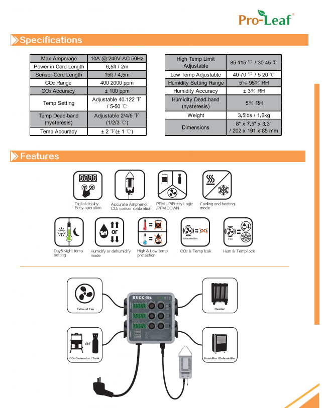 The Pro-Leaf Multi-Function Environmental Controller, BECC-B2, offers full control of the indoor garden environmental, with four 240-volt receptacles for cooling, humidity, Co2 and heating devices. This advanced unit precisely monitors and manages co2 in a range of 400-2000 parts per million with an adjustable deadband. Featuring fuzzy-logic technology to provide even greater control in compressed co2 setups. The BECC-B2 regulates tempberature in a control range of 5-50 degrees centigrade, and relative humidity in a range of 5-95 percent, both with adjustable deadbands. Photocell control allows for separate day and night settings of temperature and humidity. The BECC-B2 includes a remote sensor on a 4.5m cable with integrated photocell.