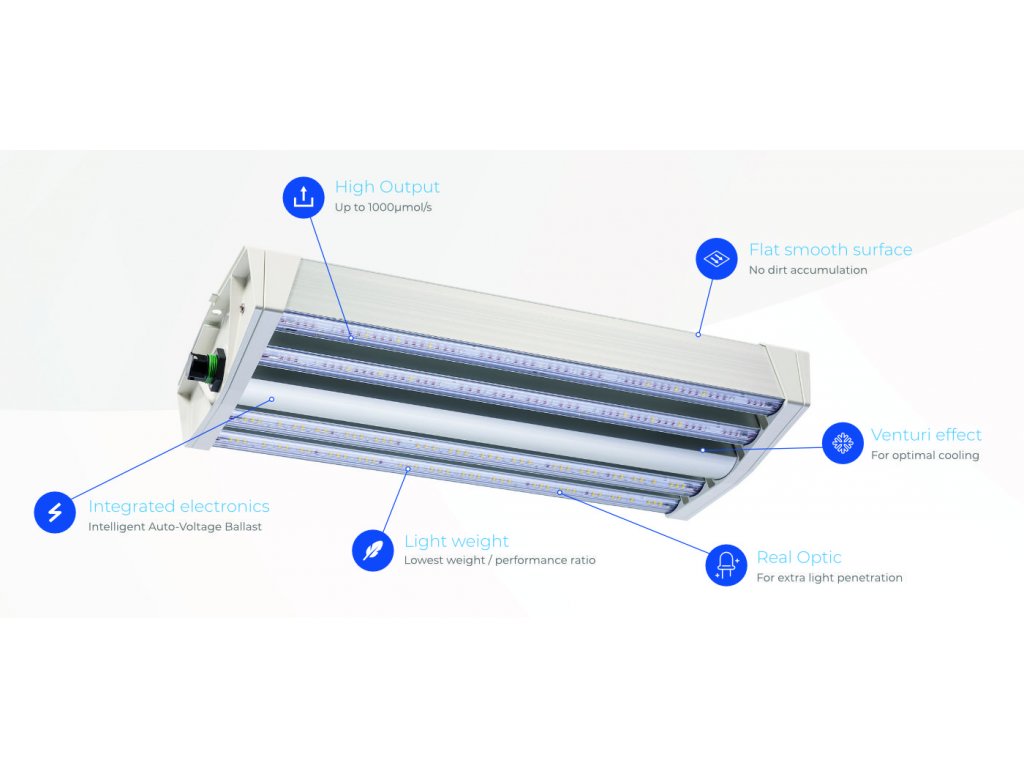The luminaires are designed in a thin, waterproof design and are suspended above the plants by an easy-hang system.