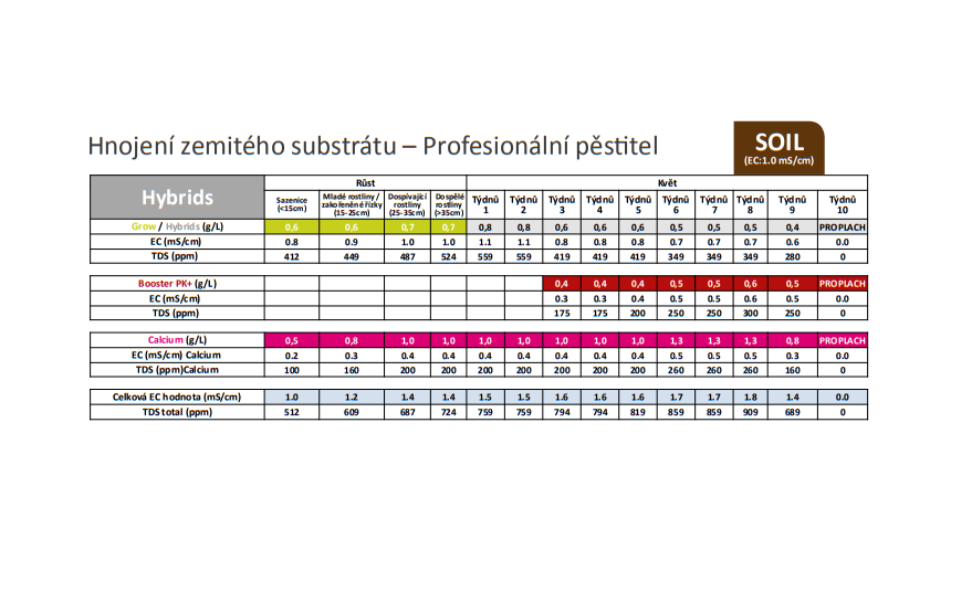 See tables in attached files: Soil Short, Soil Hybrid, Soil Long, Coco Short, Coco Hybrid, Coco Long, Rockwool Hybrid