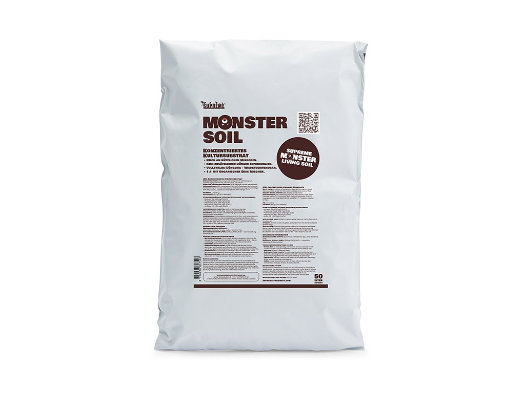 Application: Concentrated growing medium for ornamental and edible plants in pots/containers. Dilute thoroughly before use. Mix Monster Soil Concentrate 1:1 with an organic soil (e.g., organic All-Mix or Light-Mix). Example: 50 L Monster Soil Concentrate + 50 L All-Mix = 100 L ready-to-use soil.