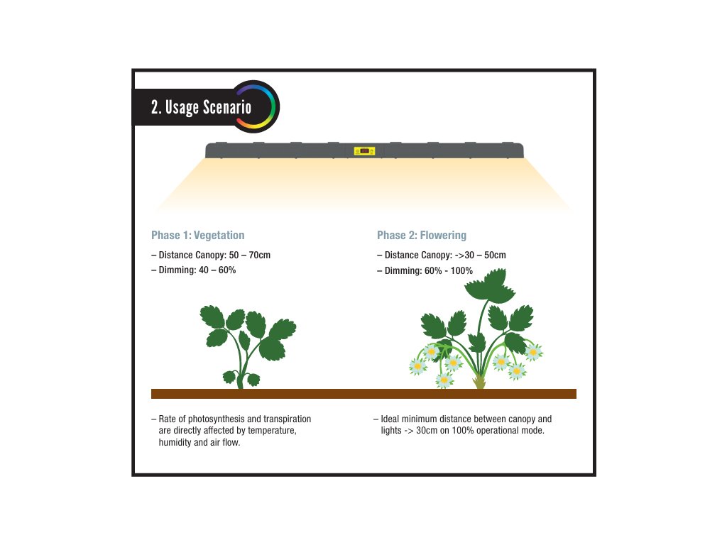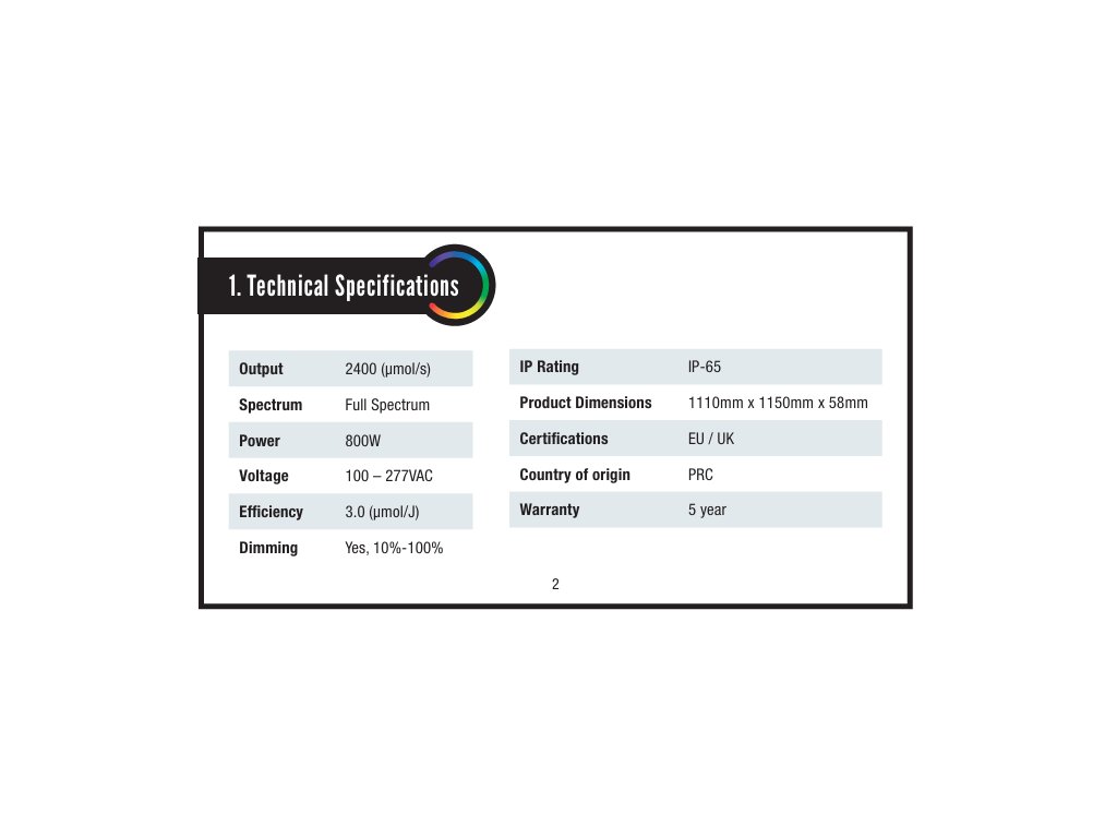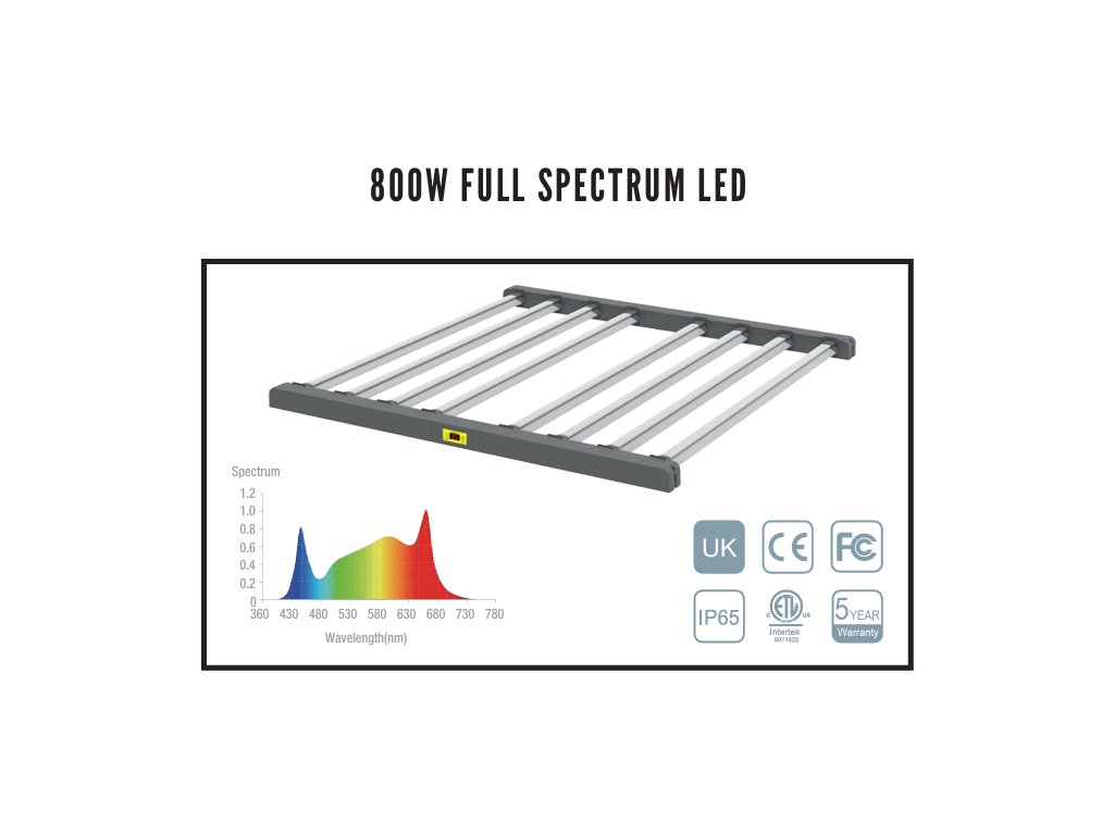Our 800W Full Spectrum LED lights provide an optimal lighting solution for all phases of plant growth. With a power output of 2400 µmol/s and an efficiency of 3.0 µmol/J, these lights ensure your plants receive the perfect amount of light, promoting healthier and faster growth. Designed to operate in harsh environments with an IP-65 rating, they guarantee durability and long-term performance.
