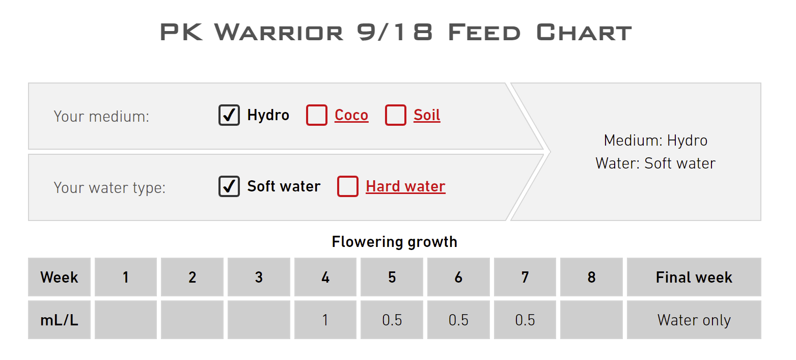 Use from the fourth week of the flowering cycle (or when flowers and fruits begin to form) and for a period of four weeks. Using in conjunction with Sumo Boost will maximise your plants demand for PK Warrior 9/18.