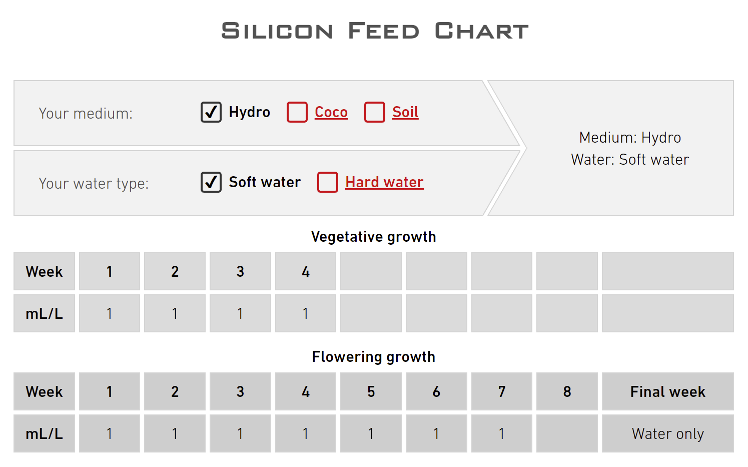 Usage: For ideal dosing you can use Shogun Fertilizers calculator or as a Root Feed add plain water to your nutrient reservoir or watering can. Then add Silicon at a rate of 1mL/L to your nutrient reservoir or watering can. Before adding the nutrient, reduce the pH to just below 7 and then add your additives and nutrients. Repeat method for tank change/refill. Use throughout the life of the crop.