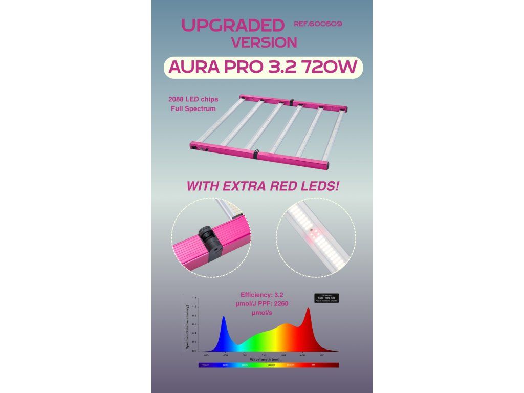 Thanks to its efficiency of 3.2 µmol/J and a PPF of 2260 µmol/s , the Aura Pro 3.2 is designed to meet the production needs of growers who prioritize intensity, stability, and control. Its full spectrum allows the unit to be used throughout the entire cycle, from vegetative growth to flowering, offering a versatile solution for different cultivation approaches and various professional setups.