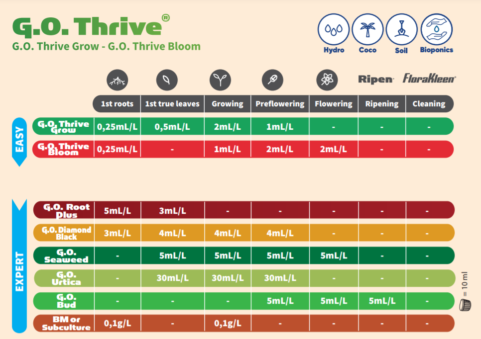 Pro Organic is very concentrated: a maximum of 2 ml/L in water is enough in soil or hydroponics.