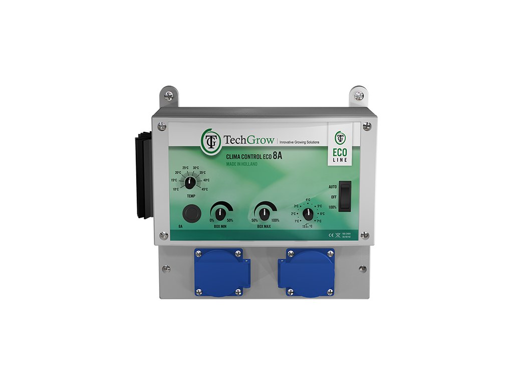 It accelerates at a slower pace than other controllers, to achieve a more stable climate. The Climate Control Eco 15A is also very easy to install. With the rotary knobs you can easily set the desired temperature and hysteresis, as well as the minimum and maximum fan speed. Modern software will do the rest!