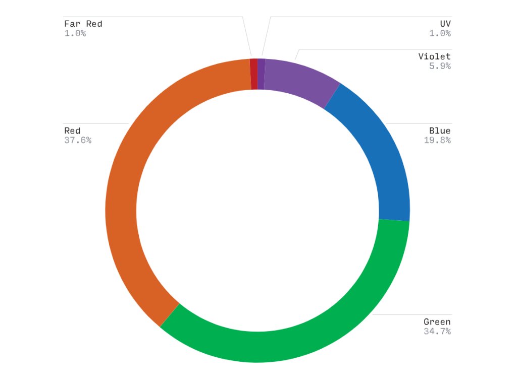 At 320W, the Dynamic 930 generates 930 µmol/s of PPF with an efficiency of 2.9 µmol/J. The combination of spectrum quality, light distribution and electrical efficiency makes the Dynamic 930 20% more effective than competing products. The unique Telos PWS1 spectrum maximises blue and green light to penetrate dense canopies. These high concentrations stimulate photosynthesis throughout the plant while reducing the risk of photobleaching and heat stress. The addition of 430nm violet pump white LEDs enhances flavonoid production and plant resilience.