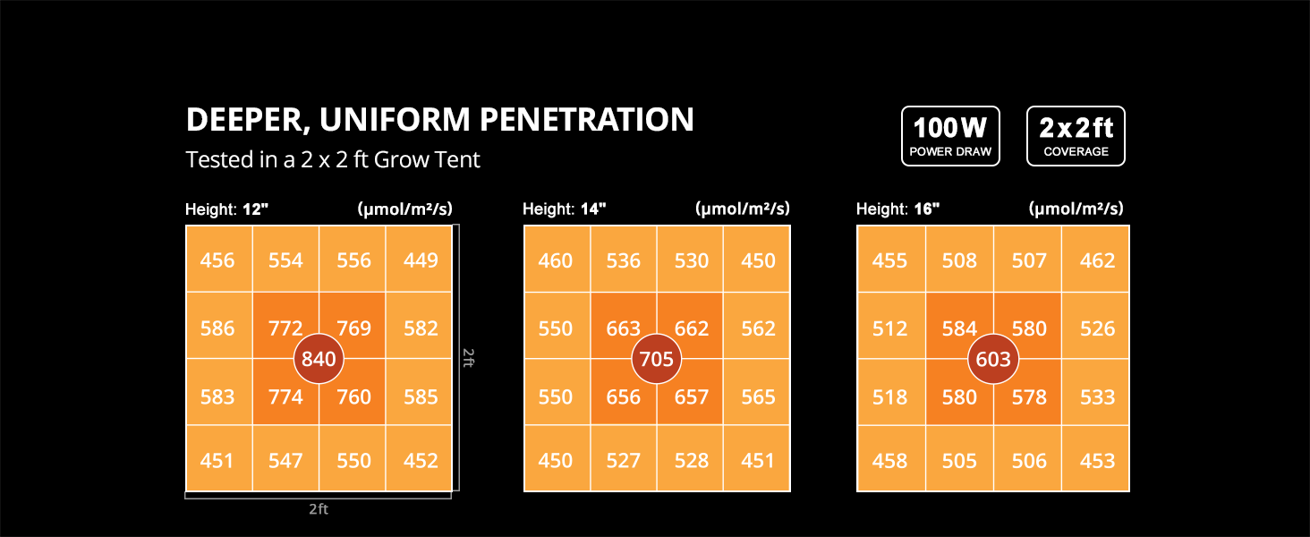 The LED diodes are arranged so that the LED panel produces even light radiation. Easy brightness adjustment via a knob is provided by the built-in dimmer with intensity regulation in the range of 15% - 100%. Unlike other grow lights on the market that require various tools for brightness adjustment, in this case, the dimmer is cleverly integrated directly into the unit. Here is a small guide on how to adjust brightness during the growing cycle based on the current development phase: